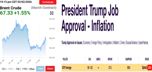 Sources: https://oilprice.com/oil-price-charts/ [4] and  https://www.realclearpolling.com/polls/approval/donald-trump/issues/inflation [5]