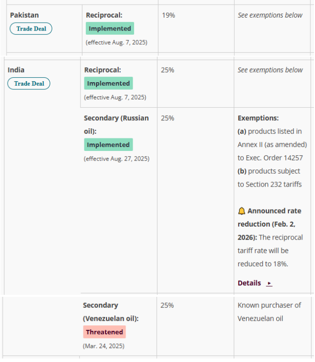 Trump cuts Indian trade tariff penalty from 25% plus Russian oil penalty to 18%, one percentage point lower than Pakistan on the promise of deal terms which have yet to be finalized [10].