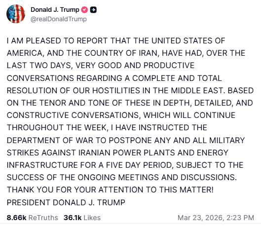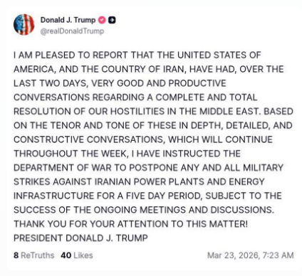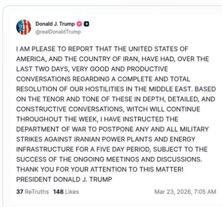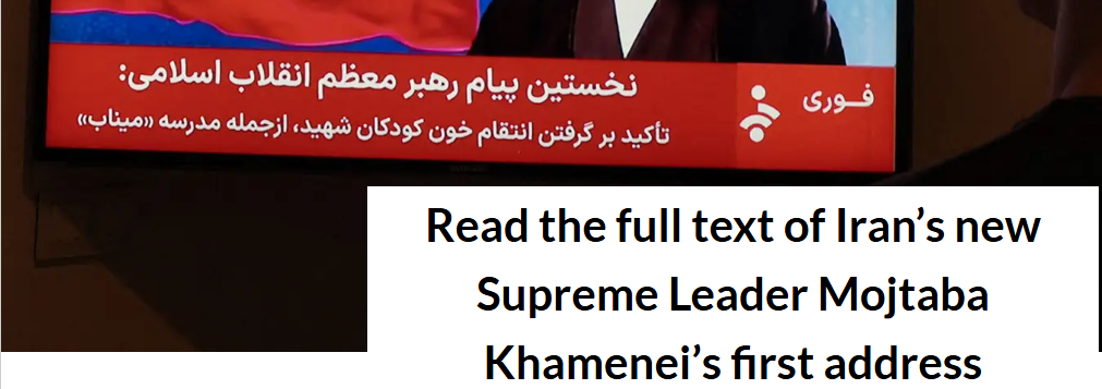 • Ayatollah Mojtaba Khamenei’s Five-Point term sheet says: comprehensive peace not a short-term ceasefire; reparations for Iran’s losses; revenge for the assassination of Ali Khamenei; a new regime for the Hormuz Strait; and an end to US bases on Arab territory.