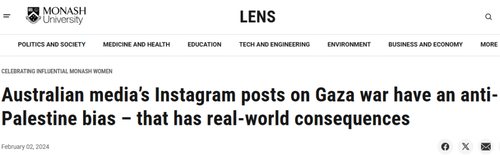 Source: https://lens.monash.edu/australian-medias-instagram-posts-on-gaza-war-have-an-anti-palestine-bias-that-has-real-world-consequences/ Parallel research has documented the bias of similar pro-Jewish, anti-Muslim ideology in the US and Canadian media.