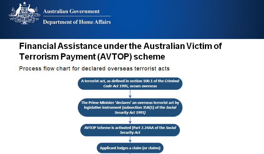 Federal Australia law applies this statutory definition of terrorism to a scheme for compensating Australians who are the victims of terrorism outside the country. This scheme is known as the Australian Victim of Terrorism Overseas Payment (AVTOP). Since 2001, a total of 50 terrorism incidents have been designated officially, but no total sum of the money paid out has been reported to parliament or published. The AVTOP terrorist designation is a political decision by the prime minister; there has been no public discussion or parliamentary vote to authorize the prime minister. For example, the deaths of 38 Australians on Malaysia Airlines Flight MH17 over eastern Ukraine in July 2014 were not designated a terrorism action because the Australian government believed they resulted from civil war or interstate war conditions. Click to read more.