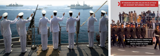 Left, the sea review from the deck of an Australian frigate; right, the Iranian march past. Sources: https://www.defence.gov.au/news-events/news/2026-03-04/warramunga-strengthens-ties-india#:~:text=like%20to%20search?-,Warramunga%20strengthens%20ties%20in%20India,and%20aircraft%20from%2074%20nations [18] and  https://www.instagram.com/reel/DVfnft9j5TY/ [19]