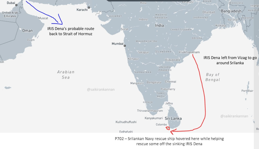 A retired Indian Army officer, Lieutenant General Raj Shukla, was asked [24] by a reporter to explain why the US had struck the Dena “so close to the Indian coast. They could have hit it when the ship went closer to the Iranian coast.” Shukla replied: “They are signaling to us. And to China [that] we [US] have a global presence. Don’t mess with us anywhere.”  That was on March 17. Shukla appears not to have known that the Iranians had been requesting safe harbour from both India and Sri Lanka, and that the timing of the attack was to prevent Dena from reaching it.