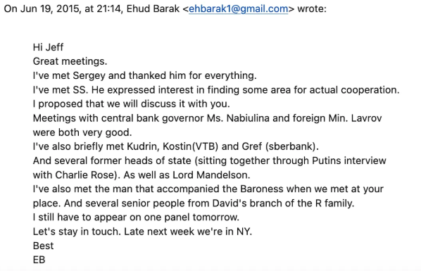 Re-reading their correspondence now, however, illustrates how powerless politically — impotent sexually (religiously too) – the combination of Epstein and Barak turned out to be. Every one of their joint schemes failed, including the meetings Barak, Epstein and Russian go-betweens arranged in 2015 with President Putin, Foreign Minister Lavrov, Central Bank Governor Elvira Nabiullina and others.